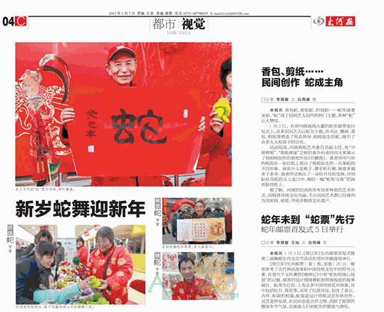 蛇年就要来到,“蛇”成了众多题材的热门主题,九点钟,活动的主办方通知我,让我以蛇创作一幅作品,首发式上要做为奖品,既然是蛇年,又是在中国邮政的邮票发行现场,我灵机一动分别在蛇的上面和下面写上了“蛇年大吉”和“中国邮政”八个大字,没想到作品刚一制作完成,就引来了众多记者的围观,纷纷拍照留念,还有很多市民表示想购买,我只能遗憾的告诉他们:这是非卖品,等会是奖品,如果有幸,或许可以免费得到。