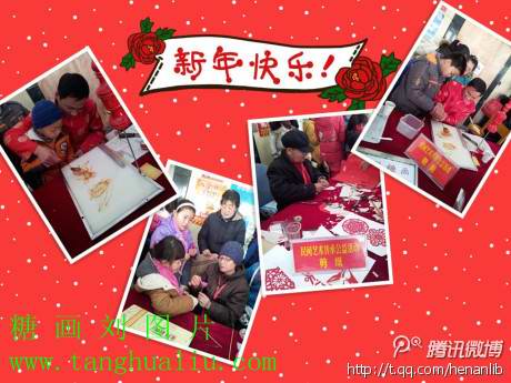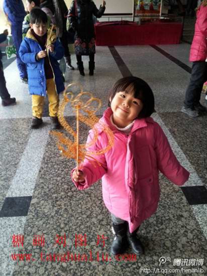 2013年2月4日下午,河南省图书馆2013“春满中原”春节系列文化活动之“把我的祝福带回你的家——民间艺术传承公益系列活动:剪纸、糖画、面塑”在二楼大厅举行启动仪式,该活动于2月5日、6日下午继续举办。